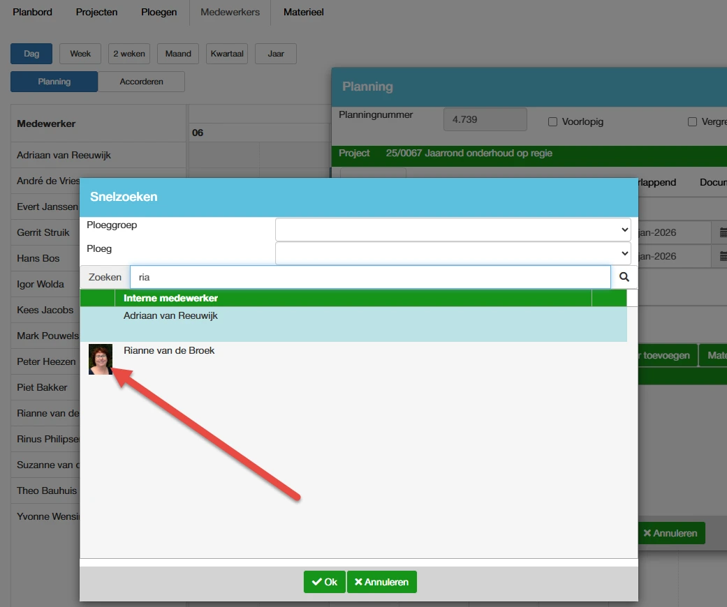 Deze informatie is te vinden in de planning op het moment dat er wordt gekozen voor toevoegen medewerkers aan de planning. Klik op de foto, of het kadertje dat gereserveerd is voor de foto.