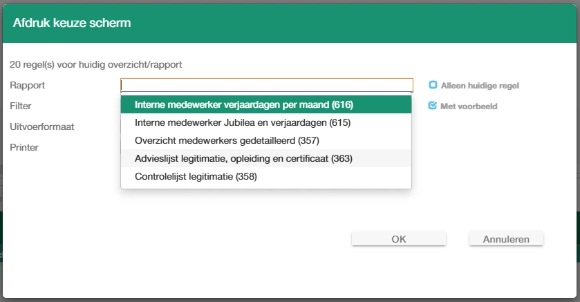 - Interne uitvoer: voor medewerkers zijn standaard brieven en mailingen beschikbaar. Dat kan bijvoorbeeld gebruikt worden om de jaaruren overzichten te versturen.