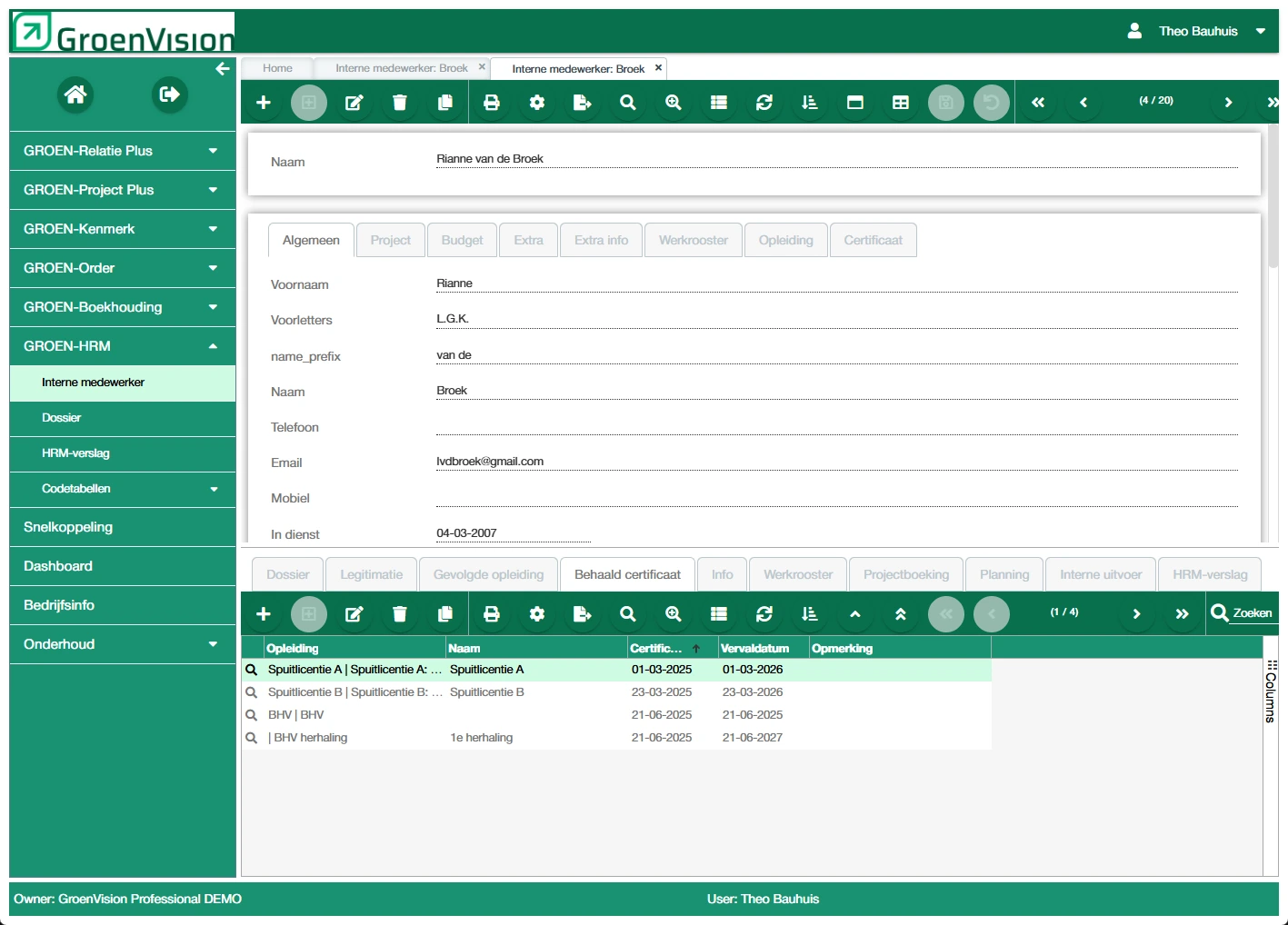 Medewerkers worden maar één keer ingevoerd, dus de lijst van medewerkers hier is dezelfde als onder onderhoud bij de interne medewerker of bij de nacalculatie. De tabbladen onder de medewerker zijn alleen zichtbaar in de module HRM, alleen gebruikers met de juiste autorisatie kunnen deze informatie bekijken.