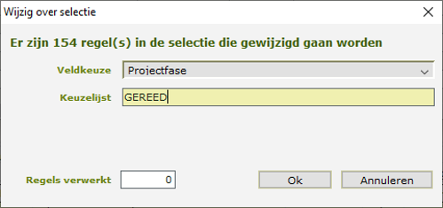 Na een klik op OK verschijnt een venster met het resultaat. De gekopieerde projecten hebben geen projectfase om verwarring te voorkomen. In het nieuwe jaar, zodra de boekingen op de projecten van 2025 gereed zijn, kunnen de oude projecten met behulp van dezelfde selecties als die gebruikt is op gereed worden gezet. De nieuwe projecten kunnen na selectie ook in één keer in uitvoering worden gezet. Dit kan worden gedaan door onder het tandwiel bij de projecten te kiezen voor “Vul velden over selectie”. In dit venster kan bij veldkeuze Projectfase worden gekozen bij keuzelijst kan de nieuwe fase worden ingegeven. Bovenaan staat hoeveel projecten worden aangepast. Controleer of dit het juiste aantal is.