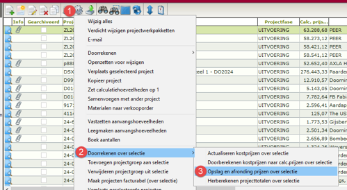 De indexcijfers komen soms pas laat beschikbaar. Het is dan ook mogelijk om in eerste instantie de projecten te kopiëren zonder index en later de juiste index door te rekenen. Dan kan in ieder geval het voorwerk van controle e.d. worden gedaan. Om de prijzen achteraf te indexeren moeten eerst de nieuwe projecten worden geselecteerd en dan kan bij de projecten onder het tandwiel (1) worden gekozen voor Doorrekenen over selectie (2) en dan Opslag en afronden prijzen over selectie (3).