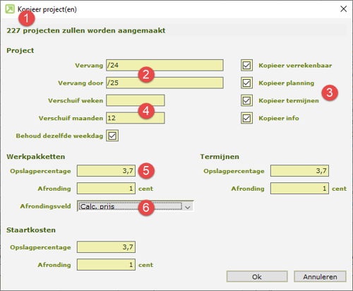 Let op! Als het beoogde nieuwe projectnummer al bezet is, wordt het automatische projectnummer gebruikt. - Wat mag gekopieerd worden: