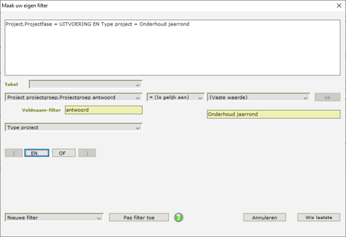 De belangrijkste en eerste stap om de onderhoudsprojecten te kunnen kopiëren is een selectie van de projecten waar het om gaat. In de meeste gevallen zal dit een filter zijn van alle projecten met status uitvoering en het projectgroep antwoord “Onderhoud Jaarrond” zoals hieronder opgezet.