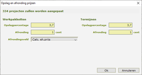 - Het index%. Dit is het percentage waarmee de verkoopprijs wordt verhoogd in het nieuw te maken project.