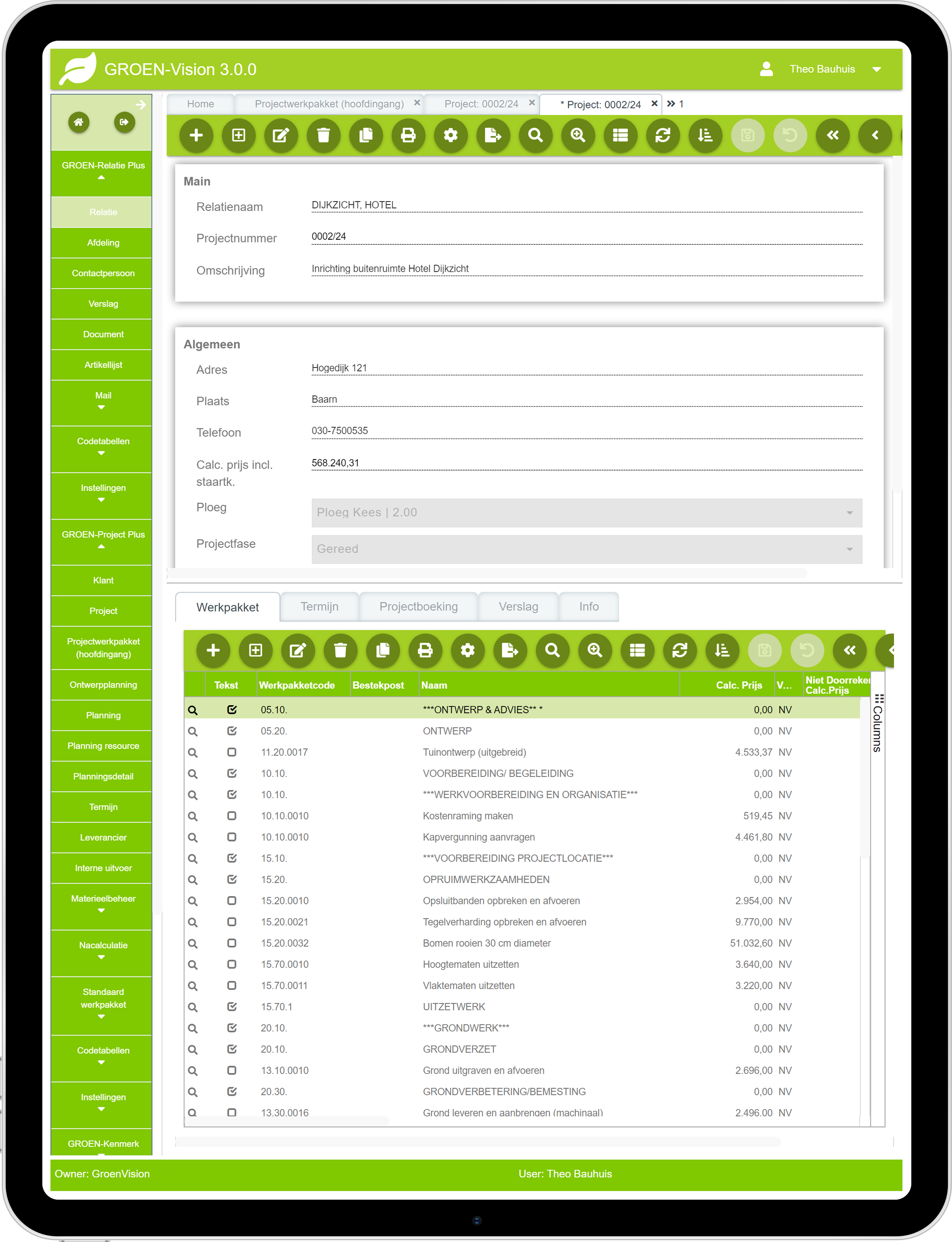 Bijvoorbeeld als je als gebruiker binnen een project bezig bent en de telefoon gaat, dan kun je direct naar relatie gaan om e.e.a. van de betreffende klant te bekijken en daarna via de tab bovenin gelijk weer terug naar het project waarmee je bezig was. Hierdoor kun je nog sneller door GroenVision navigeren en houd je de focus op je werkzaamheden.
