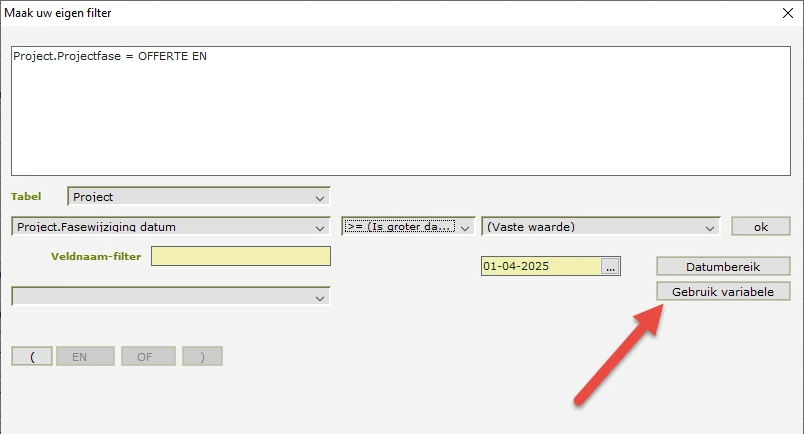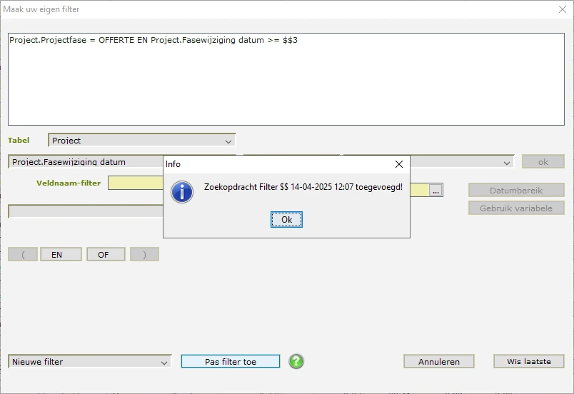 Om dat filter te maken moet je op twee zaken filteren, de projectfase en de fasewijzigingsdatum, waarbij de laatste variabel is.