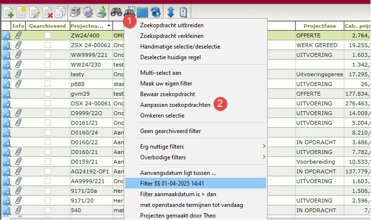 Het filter staat vervolgens in het uitklapmenu van de zoekopties (1) maar heeft waarschijnlijk nog geen naam die erg herkenbaar is. Via het menupunt Aanpassen zoekopdrachten (2), ook onder de zoekopties, kan de naam worden gewijzigd in een beter herkenbare naam. Aanpassen via het menu Zoekopdrachten onder Onderhoud kan natuurlijk ook. Klik hier voor meer informatie over zoekopdrachten.