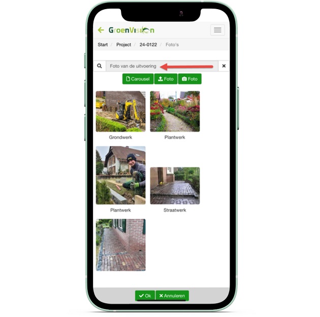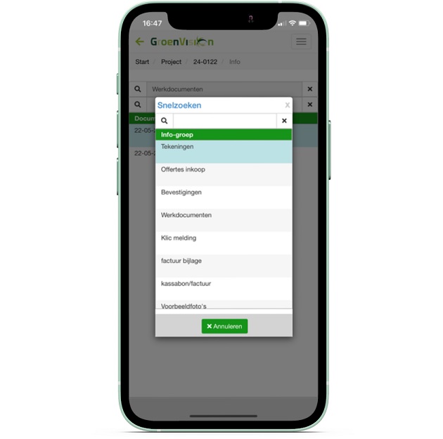 De Infogroep is ook een goed middel om te kunnen filteren welke info voor de buitenmedewerker zichtbaar is. Er kan dan bijvoorbeeld worden gefilterd zodat tekeningen en situatiefoto’s zichtbaar zijn, maar inkoopopdrachten niet.