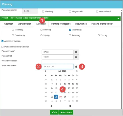Het plannen met weeknummers is heel eenvoudig. Bij een nieuwe planning is in het tabblad van de werkdagen (1) een nieuw veld toegevoegd met de weeknummers (2). Hier kunnen de weeknummers rechtstreeks worden ingetypt met een spatie tussen de weeknummers. Er is ook een datumkiezer beschikbaar (3). Met deze kiezer klik je op een dag (4), waarna het weeknummer van die dag wordt opgeslagen.