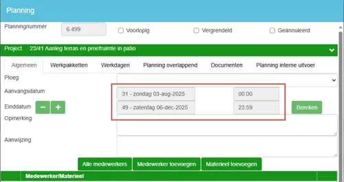 Er is één ding wat er met deze manier van plannen een beetje anders uit ziet dan als je niet met weeknummers plant. De weeknummers bepalen de begin- en einddatum van de planning. Op het eerste tabblad worden bij gebruik van weken de aanvangsdatum en einddatum grijs en ingesteld op het begin van de eerste week en het eind van de laatste week.