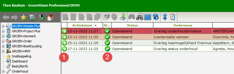 Niet alles in de actielijst heeft een verdere opvolging nodig. Soms is alleen afvinken van de actie voldoende, bijvoorbeeld bij gebruik van de mailimport. Voor die acties is er in de actielijst een optie bijgemaakt om direct in de actielijst de status op gereed te kunnen zetten, namelijk een groen vinkje (2). Door op dit vinkje te klikken wordt de status omgezet. Dus staat de status op Openstaand, dan zet een klik op het vinkje de status op gereed en omgekeerd. Als een status op gereed wordt gezet, verdwijnt deze niet gelijk van de actielijst. Dit is gedaan om het gereed melden ook ongedaan te kunnen maken. De volgende keer dat de actielijst wordt getoond staan weer alleen de openstaande acties in beeld.