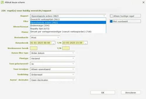 - Kies vervolgens voor het rapport <Openstaande Orders (482)>.