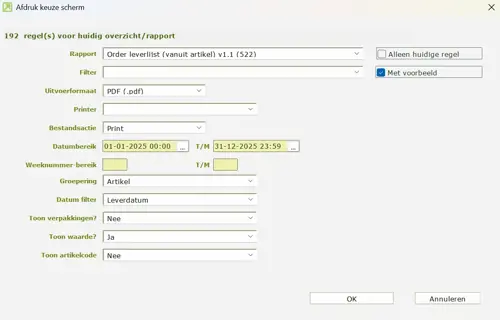 - Kies vervolgens voor het rapport <Order leverlijst (vanuit artikel) (522)>.