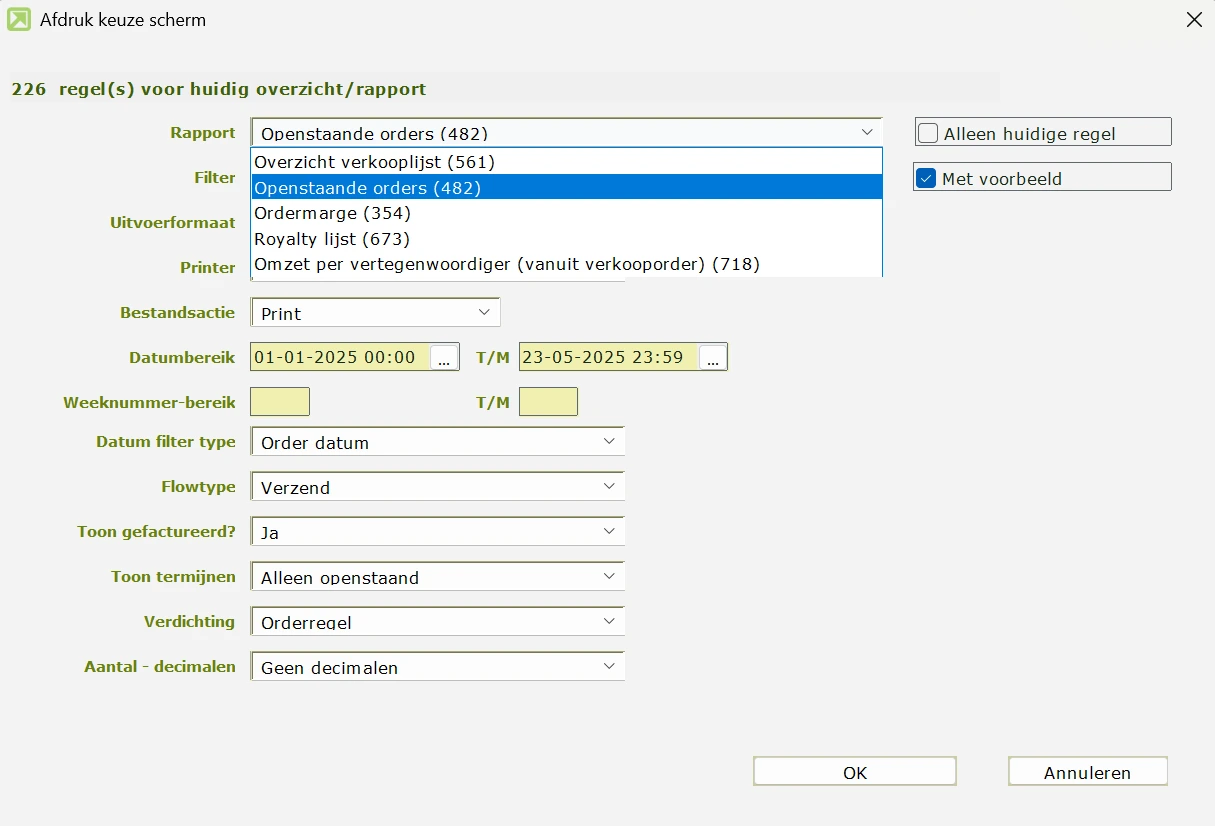 Het Rapport Openstaande Orders (482) maak je via de verkoopordertabel op onderstaande wijze: