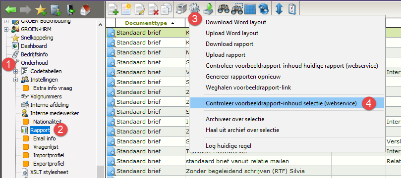De standaard rapporten die gebruik maken van het werkrooster zijn bijgewerkt op de voorbeeldserver, maar de rapporten in de eigen Vision moeten nog wel worden bijgewerkt. Dat is een kleine moeite, maar moet wel eerst gebeuren. De optie hiervoor zit bij het menupunt Rapport (2) onder Onderhoud (1). Onder het tandwieltje (3) zit de optie om alle rapporten te actualiseren (4), dat is het snelste en controleert voor alle rapporten die worden gebruikt of er nieuwere versies zijn. Selectiever kan natuurlijk ook. Zoek dan eerst de rapporten op die bijgewerkt moeten worden. Een uitgebreidere omschrijving voor het bijwerken van rapporten is te vinden in de helpdocsonline.