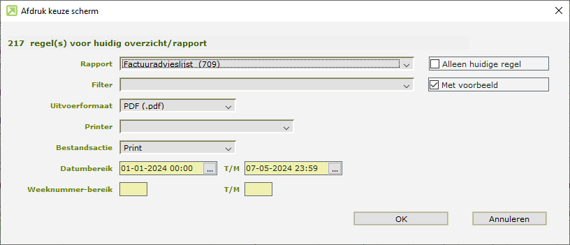 Als je nog een oudere versie van de factuuradvieslijst gebruikt, dan moet het rapport nog worden toegevoegd. Het installeren van voorbeeldrapporten wordt uitgelegd in de helpdocsonline. Als het nieuwe rapport is geïnstalleerd, archiveer dan meteen ook de oudere versie(s). Dan blijft het afdrukmenu overzichtelijk.
