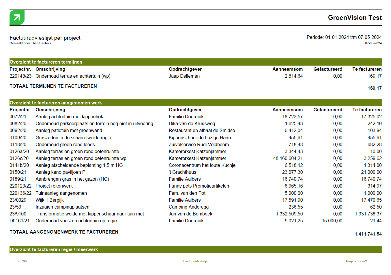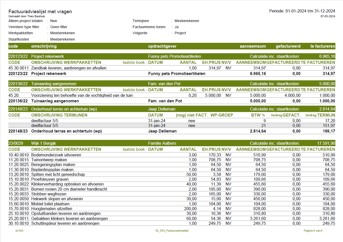 - Eén regel per project (binnen de uitsplitsing, dus als er termijnen en werkpakketten te factureren zijn, wordt een project bij beide getoond met één regel).