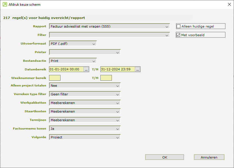 - De volgorde: Er is een vraag toegevoegd met de keuze of de lijst getoond moet worden op projectnummer of op klant.