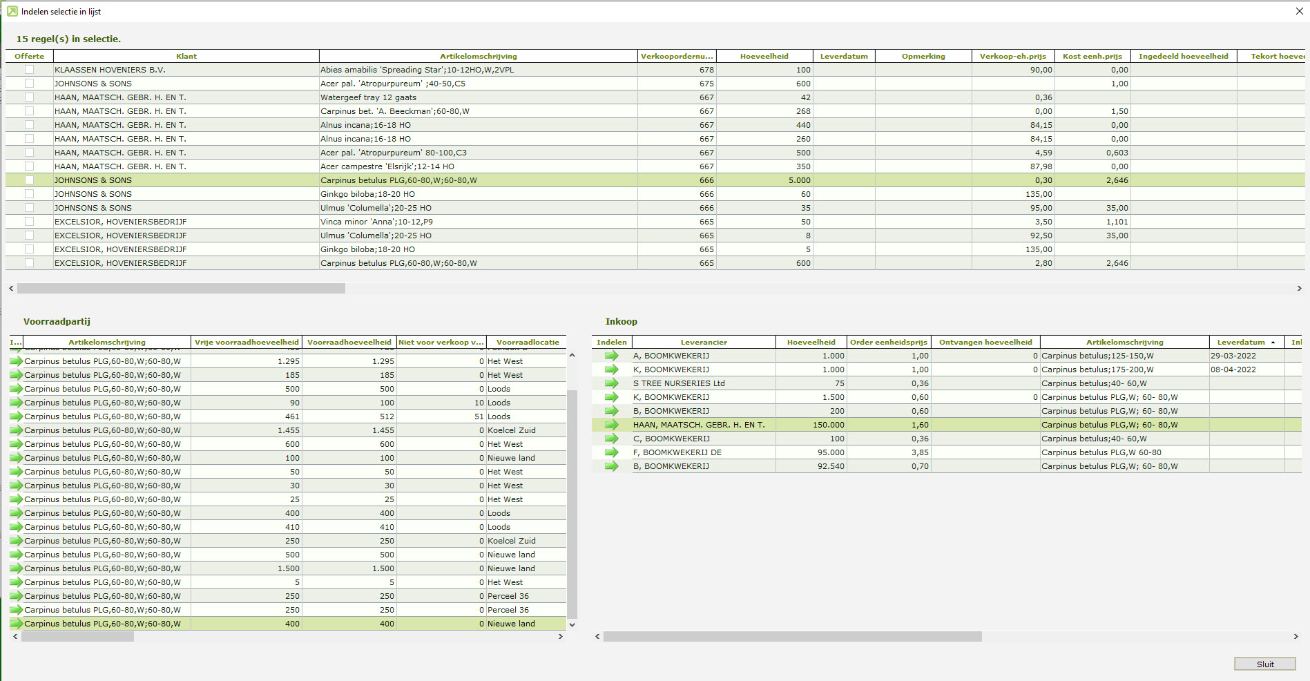 Om deze complexe taak te vereenvoudigen en versnellen, is er in GroenVision een nieuw indelingsscherm ontwikkeld. Dit scherm biedt een helder overzicht van verkooporderregels die nog moeten worden ingedeeld, de beschikbare voorraad, openstaande inkooporders, en zelfs het fictieve marktaanbod. Het doel is duidelijk: het maken van weloverwogen keuzes, tijd besparen, en de focus verleggen van kwantiteit naar kwaliteit.
