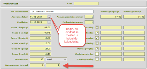 Even belangrijk voor het invoeren, het interval telt vanaf de begindatum. Dus je maakt het eerste rooster zoals hieronder. Bij het rooster voor de andere week hou je dezelfde begindatum, alleen vul je bij weeknummer interval 2 / 2 in.