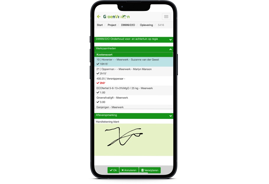 Voor gebruikers van Mobile die de digitale werkbonnen gebruiken (met de mogelijkheid om planning in te zien en te boeken) is er ook de optie om de klant te laten tekenen voor de oplevering van het werk. Dit is vooral handig bij regiewerk. Daarnaast is het ook handig om de klant de oplevering te kunnen sturen.
