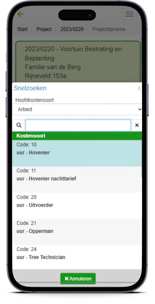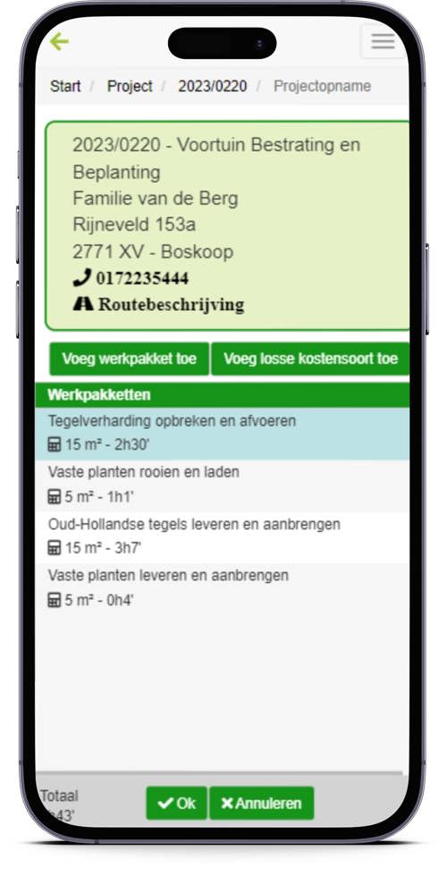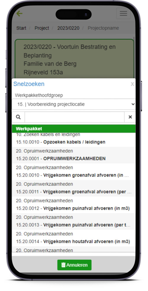 Ter plekke op de projectlocatie kun je op je mobiel of tablet nieuwe klanten en projecten toevoegen en direct bij deze projecten de opname doen van de te verrichten werkzaamheden. Deze hoeveelheden kunnen standaard werkpakketten en/of losse kostensoorten zoals uren en materialen zijn.