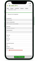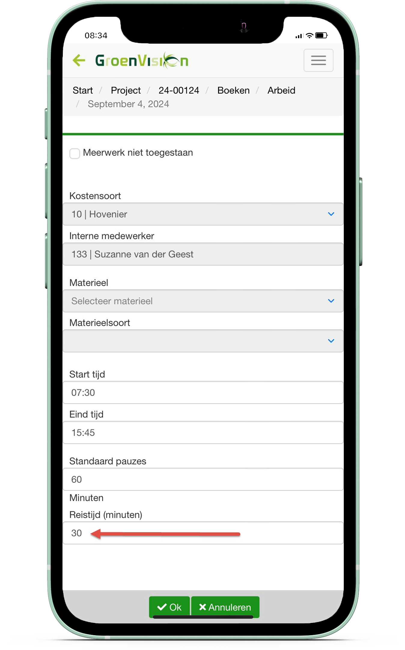 Onder de balk met uren en minuten, of onder de velden met werktijden zit een veld waarin de reistijd in minuten kan worden aangegeven. .