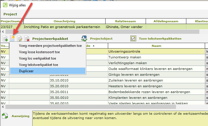 Met de knop Nieuw extra kan vanuit het Wijzig alles scherm worden gekozen voor het toevoegen van meerdere werkpakketten, losse kostensoorten toevoegen, los- of tekst werkpakket toevoegen en ook de knop dupliceer is hieraan toegevoegd.
