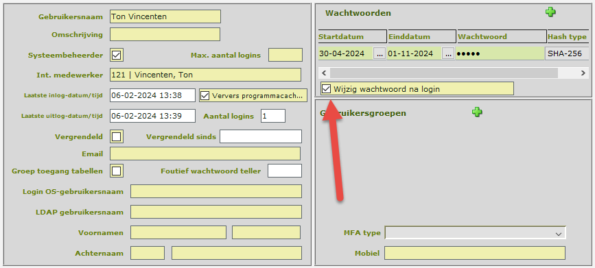 De eerste stap is ongewijzigd gebleven. Het aanmaken van een gebruiker en het instellen van een wachtwoord gebeurt door een beheerder. Het grote verschil is dat er tegenwoordig een aanvinkoptie beschikbaar is: wijzig wachtwoord na login.