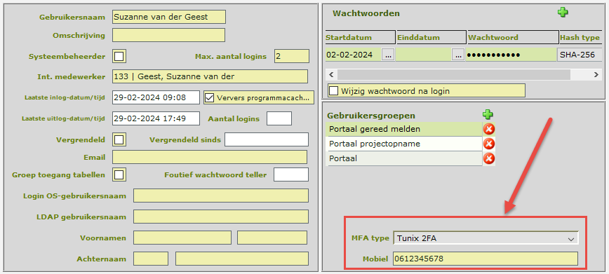 - In Vision wordt bij de gebruiker ingesteld dat de gebruiker zijn inlog moet bevestigen en op welk telefoonnummer de app zich moet melden.