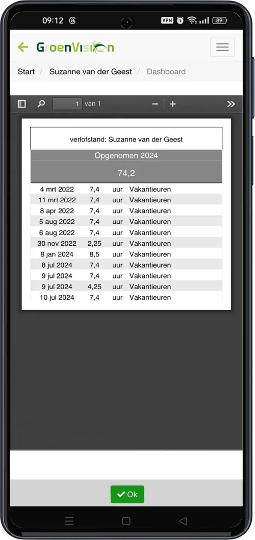Op basis van dit rapport kan worden bepaald hoeveel uren er boven de jaaruren zijn gemaakt en hoeveel vakantie-uren er resteren. Welke uren worden uitbetaald en welke mee gaan naar het volgende jaar worden niet door het programma bepaald.