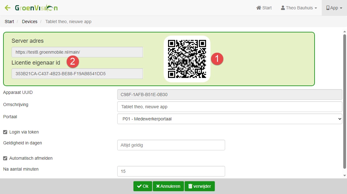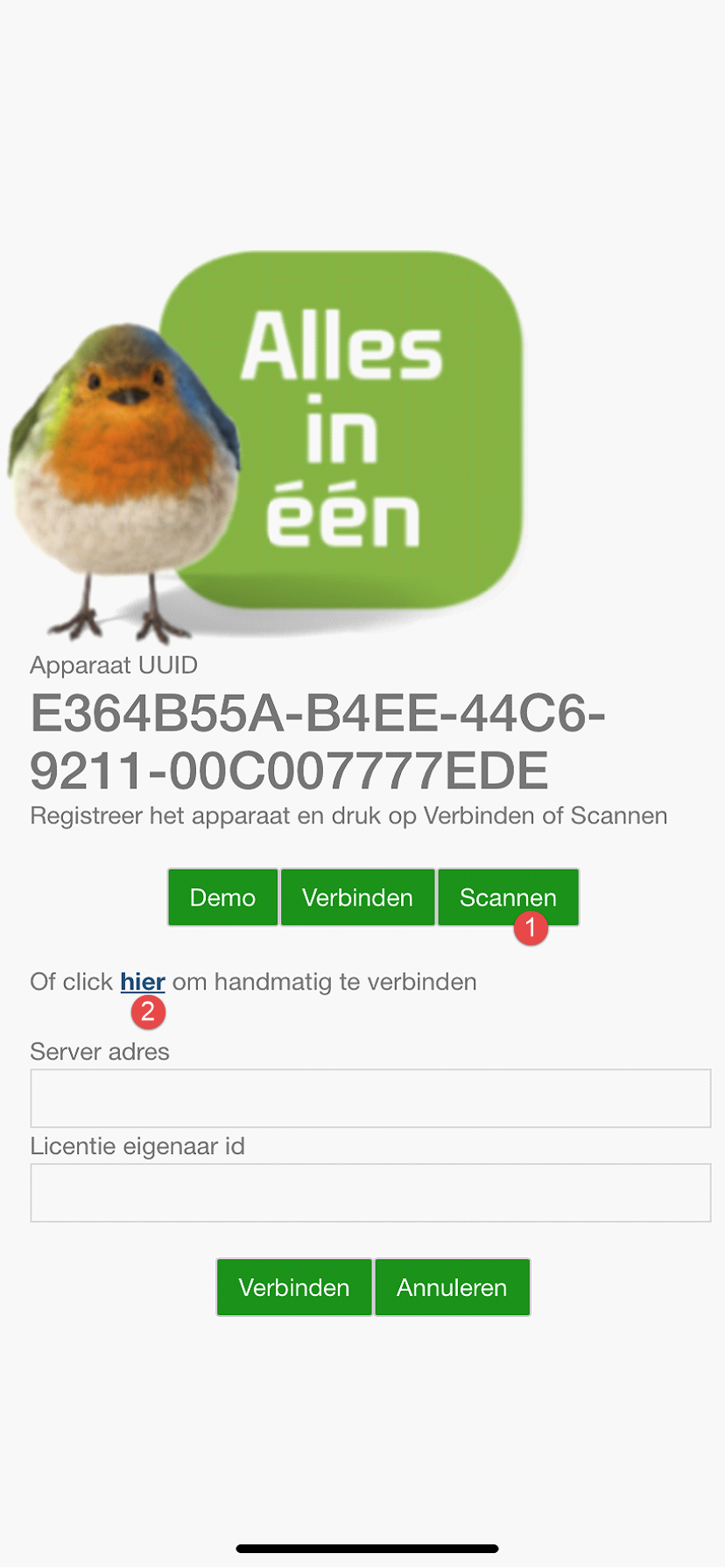 Waar voorheen bij het toevoegen van een apparaat het invoeren van het UUID voldoende was om de bezitter van het apparaat op connect te laten drukken, moet vanaf versie 1.1.281 de servernaam en licentiecode worden ingesteld in de app. Dit kan op twee manieren.