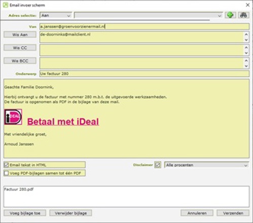 Wil je de factuur per e-mail versturen via GroenVision? Dan kun je de iDeal link toevoegen in de e-mail info. De iDeal link wordt in de begeleidende email opgenomen en is aanklikbaar zodat de klant de factuur direct kan betalen, zonder de factuur eerst te openen.