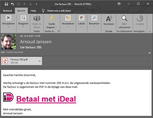 Het is ook mogelijk om de iDeal link in de factuur lay-out op te nemen zodat de klant na het openen van de factuur, de iDeal link ziet staan en direct kan aanklikken om de factuur te betalen.