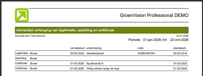 Zoals hierboven gemeld is het mogelijk om op te volgen welke certificaten of ID-bewijzen dreigen te verlopen. Hiervoor zijn binnen HRM verschillende lijsten beschikbaar. Door deze te versturen via een batchjob (de automaat van Vision) kan een medewerker wekelijks of maandelijks een mailtje ontvangen met de zaken die opgevolgd moeten worden. Leuk extraatje, er is ook een lijst voor de aankomende jubilea. Zo kun je ook geen werkjubileum meer missen.