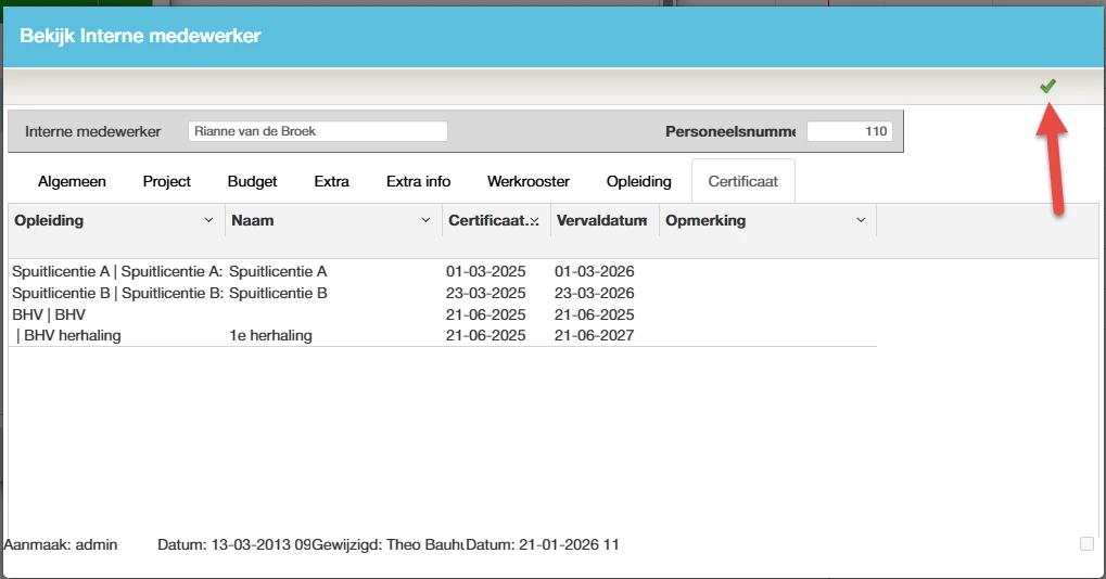 Er verschijnt nu een detailscherm van de medewerker waarin de gegevens van de medewerker staan. Handig om te zien of het juiste certificaat beschikbaar is, maar ook om snel even het telefoonnummer op te zoeken of te kijken naar het werkrooster.