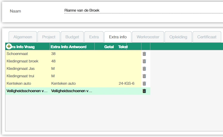 - Extra info: dit zijn keuzes die naar voorkeur kunnen worden ingesteld. Denk aan bijhouden welke kleding en schoeisel is verstrekt, het vastleggen van schoenmaten, bedrijfskledingmaten en sleutelbeheer. Door de opzet kan elk soort informatie worden bewaard. Een keuze tabel, een tekstveld of getallen.