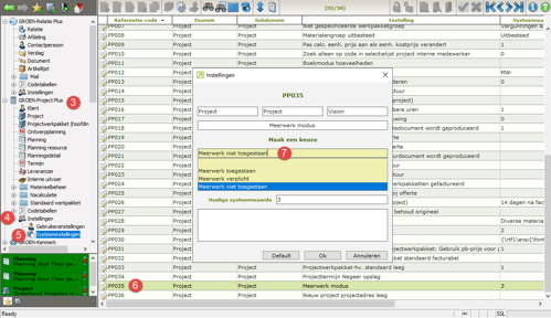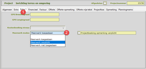De standaardinstelling van de meerwerkmodus is leeg, maar het is mogelijk om bij de systeeminstellingen van project een standaard instelling te doen. Is bijvoorbeeld 80% van de projecten regie, dan is het handig om Meerwerk verplicht als standaard in te stellen. Elk project dat gemaakt wordt nadat de instelling is gedaan, krijgt standaard de voorkeursinstelling mee.