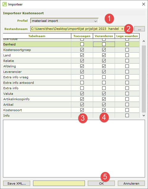 Bij het importeren worden de prijzen van al aanwezige materialen bijgewerkt en kunnen nieuwe materialen worden toegevoegd aan het materialenbestand. De sleutel die bepaalt of een materiaal al in het materialenbestand bestaat is de combinatie van de leverancier en de bestelcode.