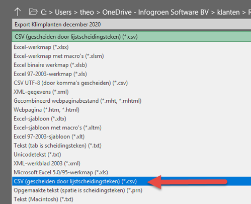 - Als het bestand goed is ingedeeld sla het dan op en kies vervolgens voor Opslaan als. Kies bij opslaan als voor CSV (gescheiden door lijstscheidingstekens) (*.csv).