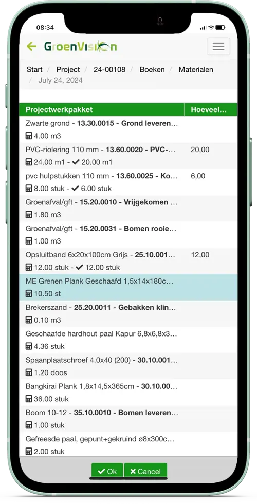 Om het boeken van de materialen te versnellen is de knop Nieuwe boeking via lijst toegevoegd bij het boeken van materialen. In de lijst wordt de materiaalomschrijving getoond, met daarachter een kolom om de hoeveelheden in te vullen. Een dubbeltik in die kolom opent het veld om de gebruikte hoeveelheden in te vullen.
