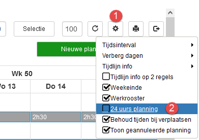 Als medewerkers voor het inplannen worden geselecteerd kan het zijn dat een medewerker al deels of helemaal is ingepland. Zodra dat het geval is wordt het tabblad Overlap (1) rood. Dat is al langer zo. Aan dit tabblad is een nieuwe optie Accepteer overlap (2) toegevoegd. Indien deze optie is aangevinkt worden de medewerkers dubbel gepland. Dat is erg handig voor degene die graag met het slepen van de planblokken de planning goed zet. Het vinkje staat automatisch aan.