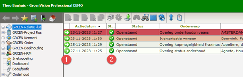 Een belangrijk hulpmiddel voor de opvolging is het groene pijltje, dat vanuit de actielijst kan worden aangeklikt. Om de acties snel te openen is er al het groene pijltje (1), dat het verslag opent, zodat de tekst van het verslag helemaal zichtbaar wordt met daarboven de gegevens van de relatie met zijn telefoonnummer. Dit is een hele snelle optie, vooral voor acties waar een vervolg op plaats moet vinden, zoals een nieuw verslag of een aanvulling.