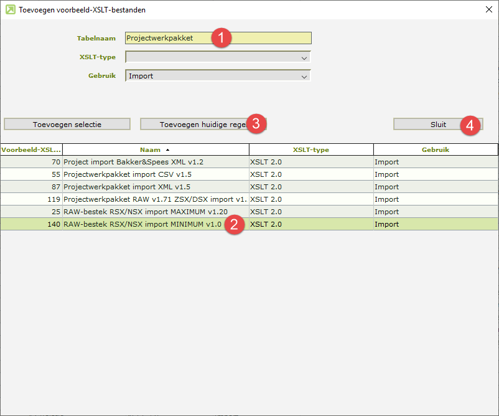- Klik de regel aan met omschrijving “RAW-bestek RSX/NSX import MINIMUM v1.0” (2) en klik op Toevoegen huidige regel (3)