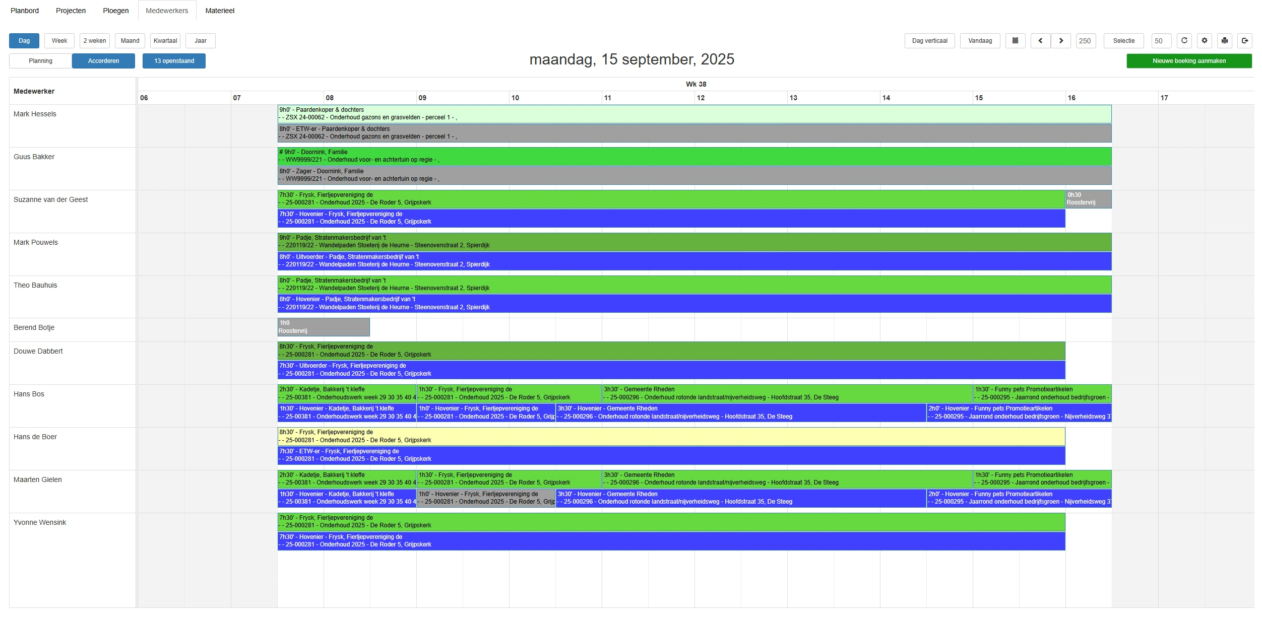 Minstens zo interessant is de weergave op project. Met toon details actief zie je in één keer de boekingen van je mensen en de geboekte machines en de materialen. De materialen hebben geen tijdstip, dus die krijgen een planblok van een hele dag.
