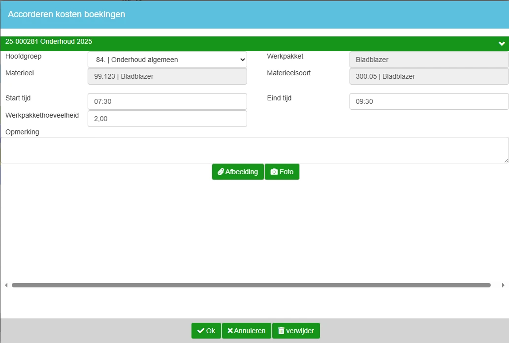 In de weergave van de medewerker verschijnt boven in beeld (1) een overzicht van het aantal uren dat volgens werkrooster beschikbaar is, het aantal uren dat is gepland en het aantal uren dat daadwerkelijk is geboekt. In de onderste helft worden de boekingen getoond. Accorderen doe je door een vinkje in de kolom OK (2) te zetten. Wil je alles in één keer akkoord geven, dan klik je op Selecteer alle (3). Het is in dit scherm ook mogelijk om een boeking aan te passen. Dat doe je door de boeking aan te klikken. Dan verschijnt het wijzigscherm van de boeking zoals die ook in Mobile gebruikt wordt. Als het gaat om een meerwerkboeking, dan wordt ook het veld met de werkpakkethoeveelheid getoond. Als bij het boeken een afbeelding is toegevoegd, dan verschijnt deze als miniatuur in beeld.