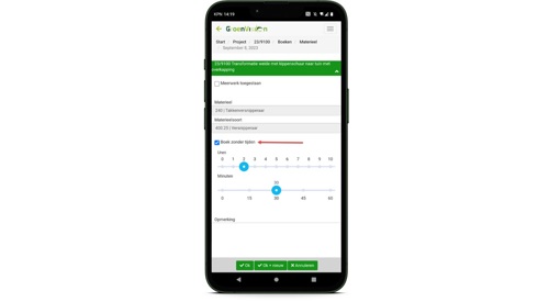 Bij het boeken met tijden wordt gevraagd van hoe laat tot hoe laat er is gewerkt. Dat werkt prima voor mensen en voor materieel dat de hele dag is gebruikt, maar voor materieel dat maar een deel van de tijd is gebruikt, levert dat rekenwerk op. Daarom is nu bij materieel een aanvink optie toegevoegd: “Boek zonder tijden”. Indien aangevinkt verschijnen de bollen om de tijd te boeken.