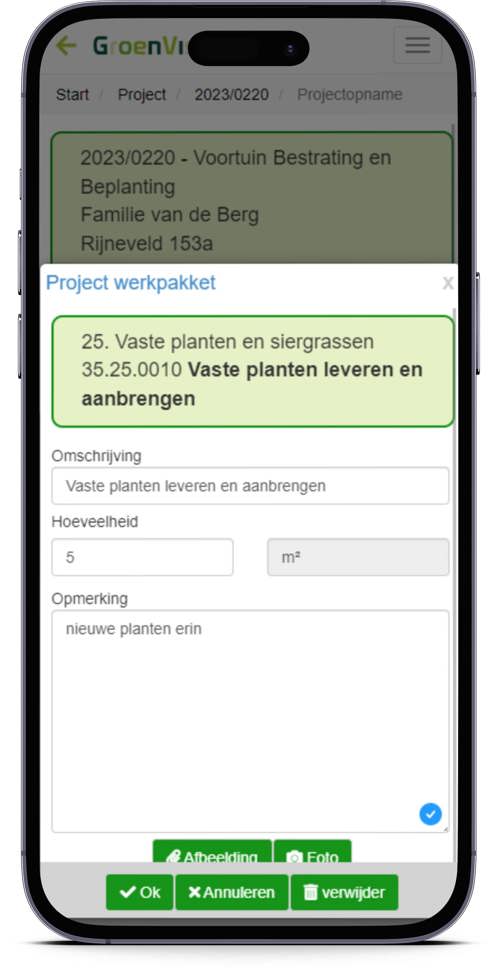 Ter plekke op de projectlocatie kun je op je mobiel of tablet nieuwe klanten en projecten toevoegen en direct bij deze projecten de opname doen van de te verrichten werkzaamheden. Deze hoeveelheden kunnen standaard werkpakketten en/of losse kostensoorten zoals uren en materialen zijn.