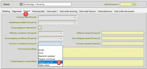 Bij de klant wordt ingesteld dat de voorkeurs verzendwijze van de factuur “Peppol via API” is. Dit kan worden ingesteld bij de klant op het tabblad Project (1). Daar is het veld Factuur voorkeur (Project) beschikbaar. In dit veld kun je aangeven dat de factuur voorkeur Peppol via API (2) is.