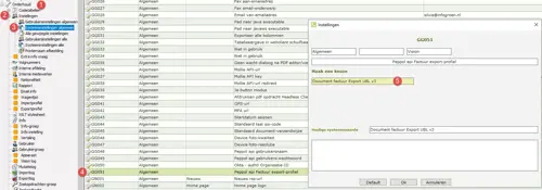 Bij de algemene systeeminstellingen (bereikbaar via Onderhoud (1), instellingen (2), systeeminstellingen algemeen (3)) is systeeminstelling GG051 (4) Peppol api Factuur export-profiel beschikbaar. Hier kan het hierboven aangemaakte exportprofiel worden ingesteld (5). Deze instelling wordt dan toegepast in alle gevallen waar de factuur voorkeur op Peppol via api of Peppol via e-mail is ingesteld.